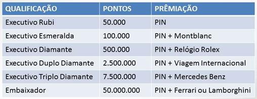 Para uma pessoa se tornar Diamante, terá que alcançar 500.000 pontos em sua rede.